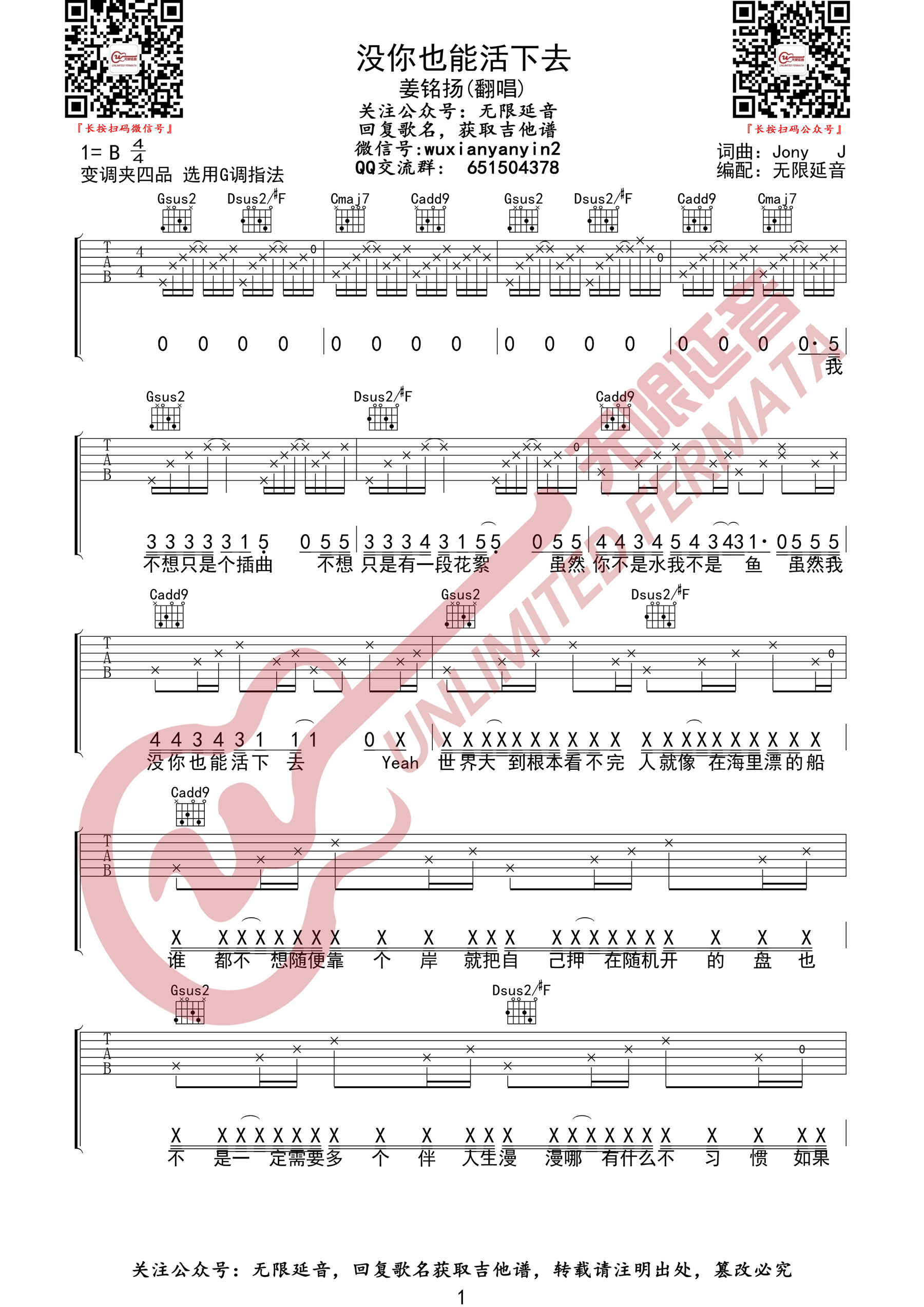《没你也能活下去》是姜铭杨演唱的一首歌曲,4/4拍的节奏,这首歌曲的原调为B调,这里曲谱采用了G调指法进行编配,演唱时夹变调夹4品可回到原调,来源于@无限延音编配出品。这首情歌它并不温暖,甚至清醒得有些冷酷,但却暗含着最深的情谊和最真挚的祝福。希望听到这首歌的你,也能在茫茫人海中遇到那个愿意共度余生的人。