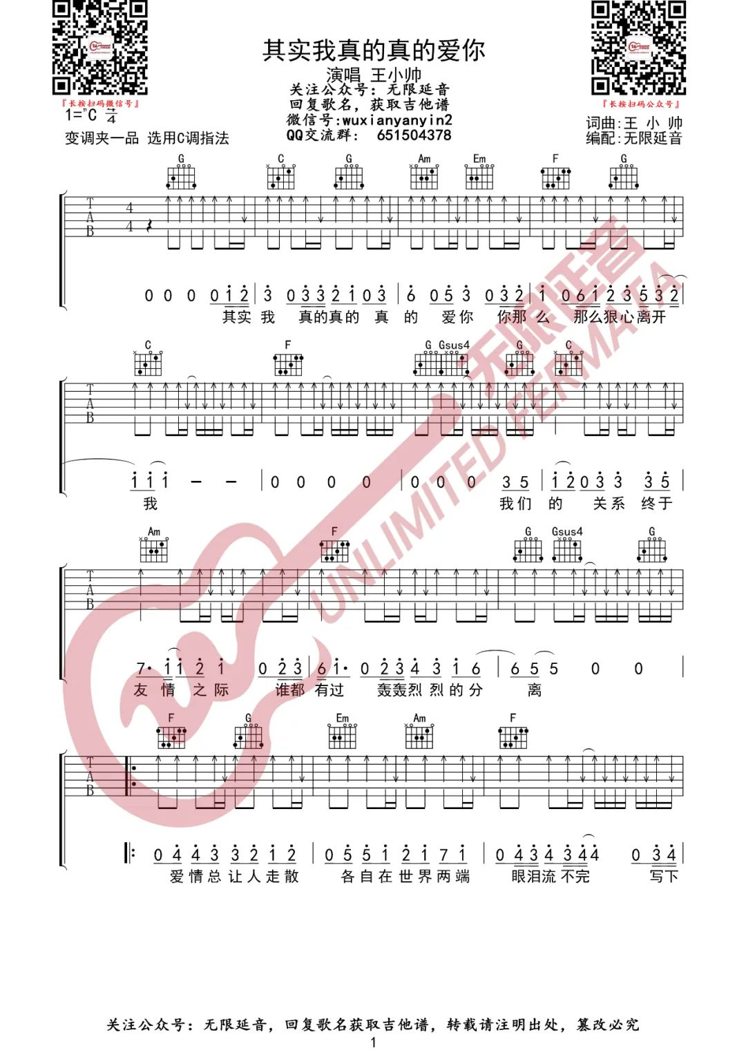 《其实我真的真的爱你》王小帅 C调原版 吉他弹唱谱