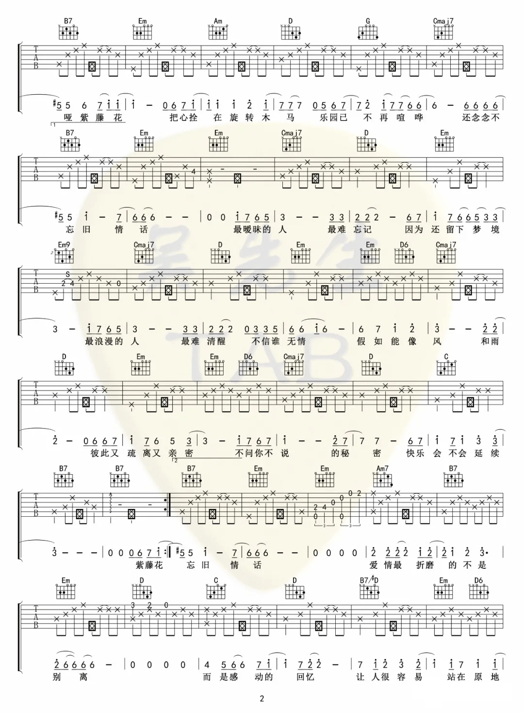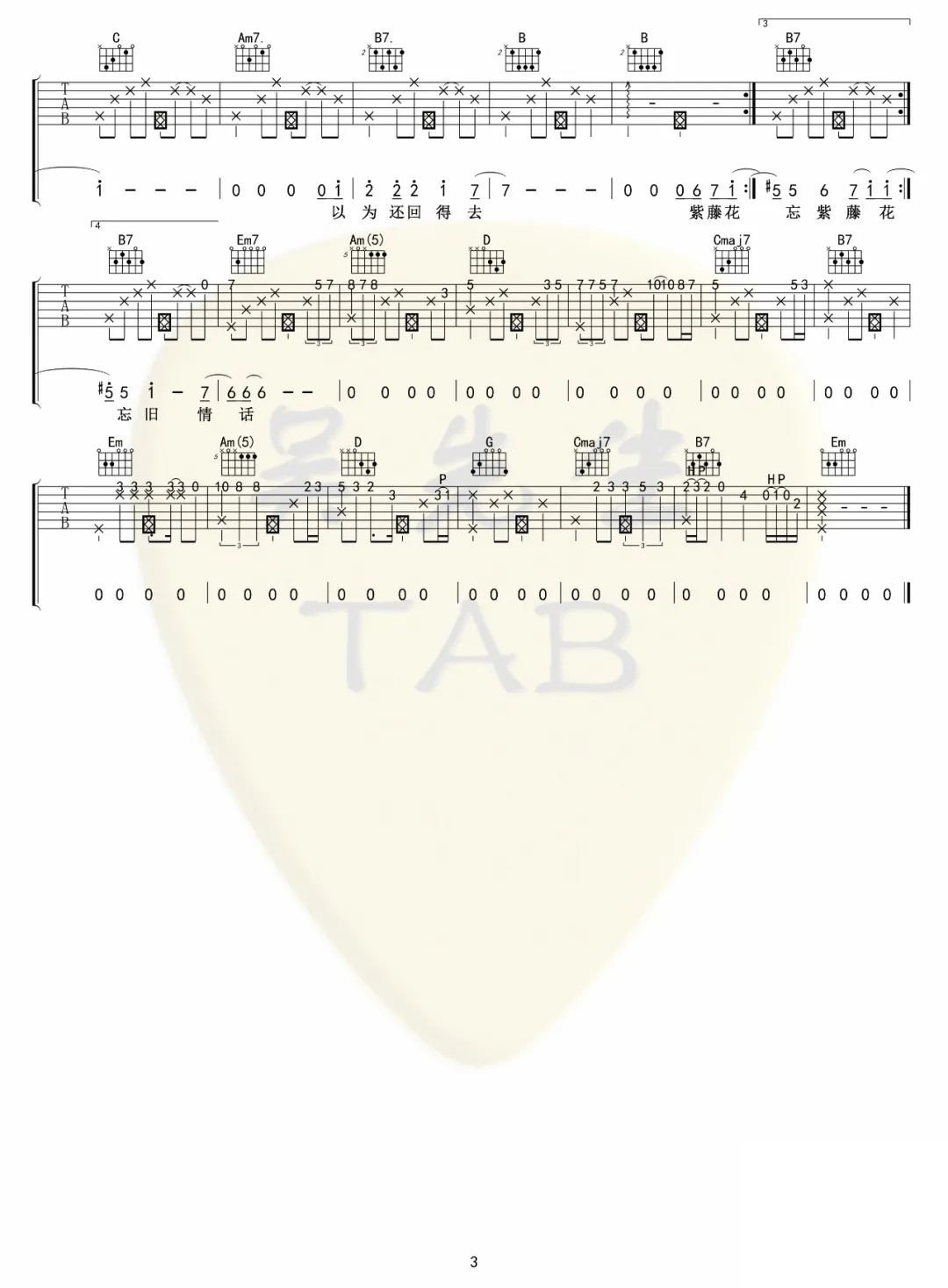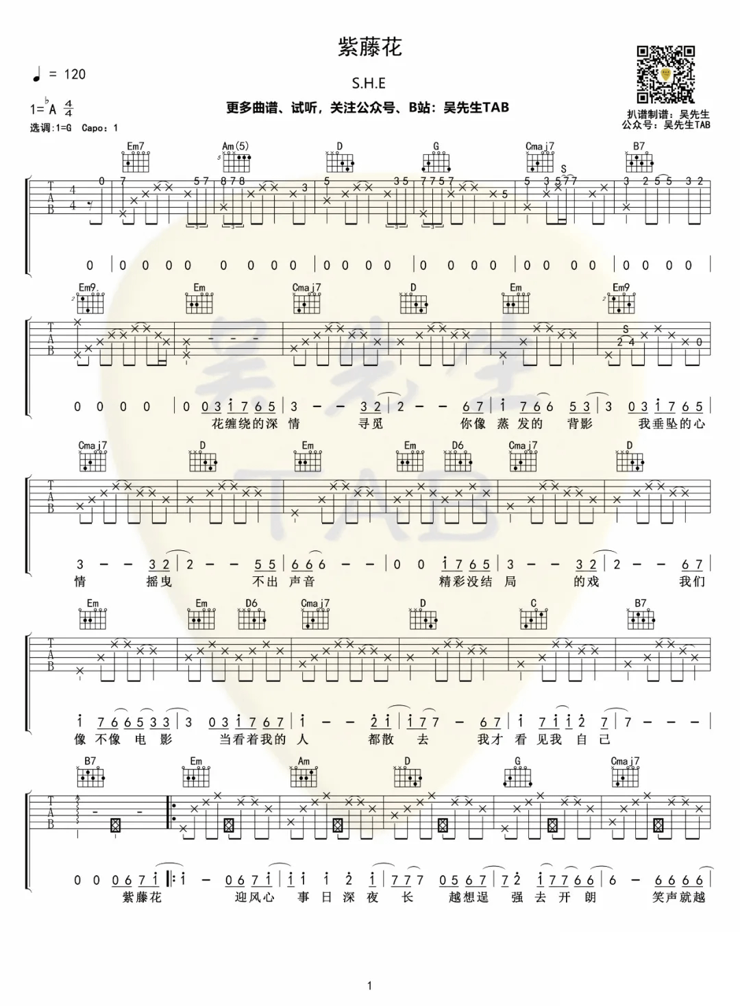 S.H.E演唱的一首歌曲,4/4拍的节奏,这首歌曲的原调为降A调,这里曲谱采用了G调指法进行编配,演唱时夹变调夹1品可回到原调,也可根据个人实际嗓音情况选择。来源于@吴先生TAB编配出品。 《紫藤花》是由S.H.E演唱的伤感情歌,姚若龙填写中文词,原曲是Westlife的《Soledad》。该歌曲于2006年7月21日正式发行,被收录于S.H.E的新歌精选辑《Forever》中。