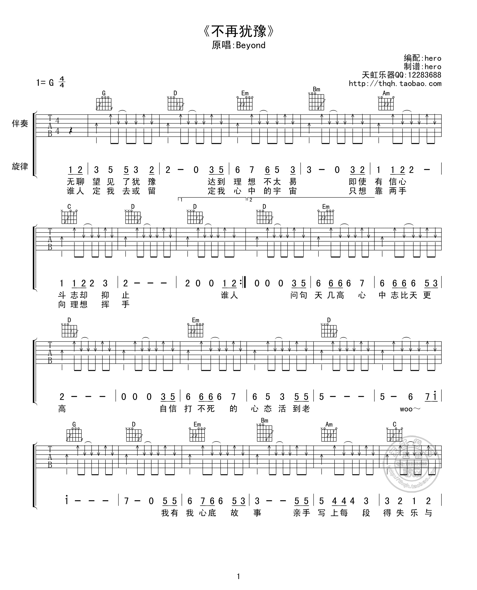 《不再犹豫》beyond G调 吉他弹唱谱