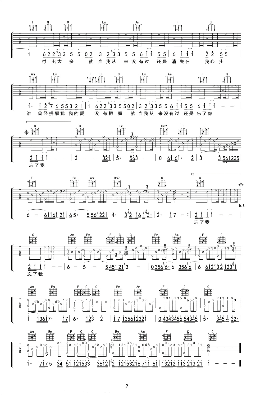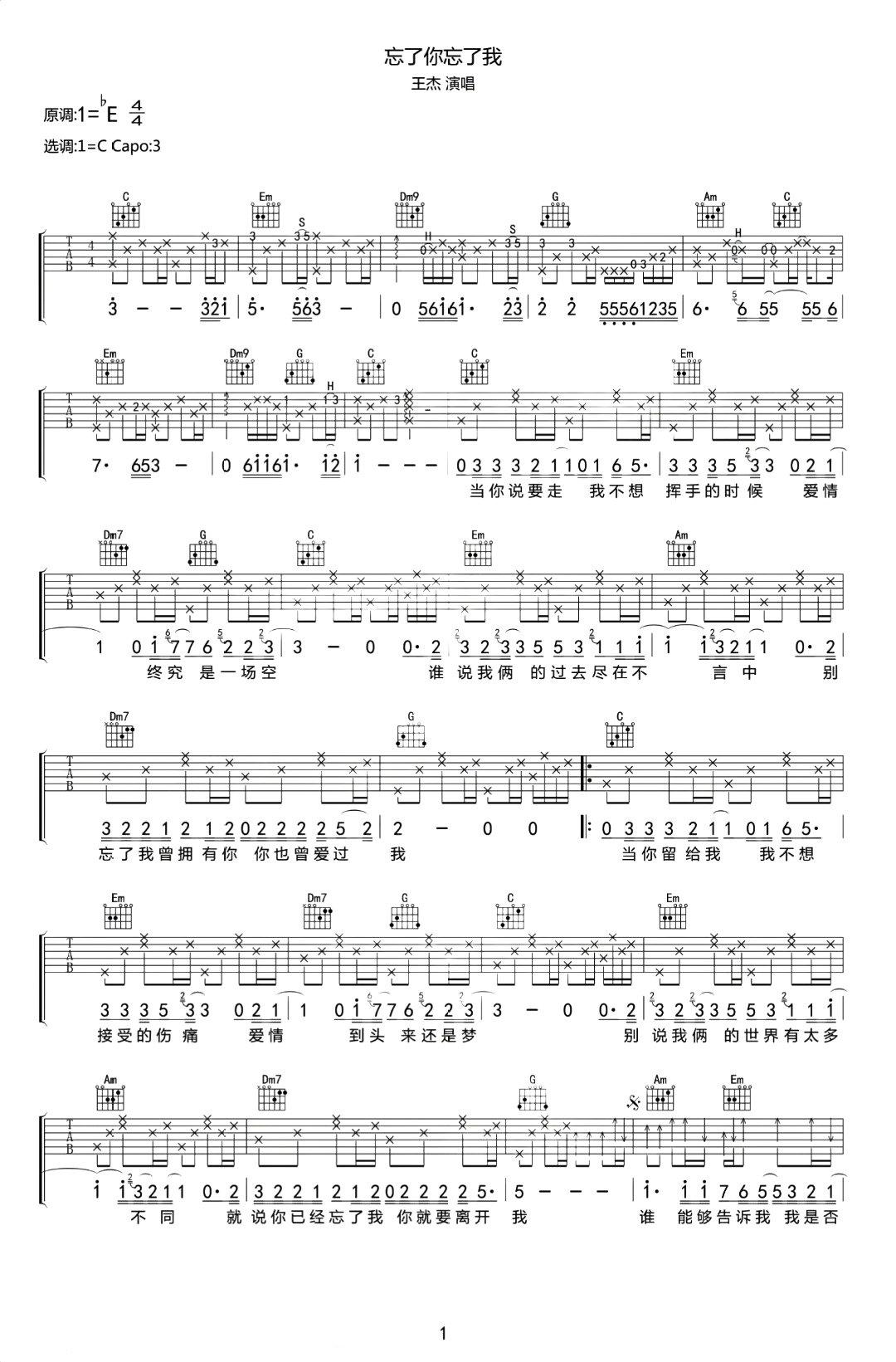 王杰《忘了你忘了我》C调 吉他弹唱谱