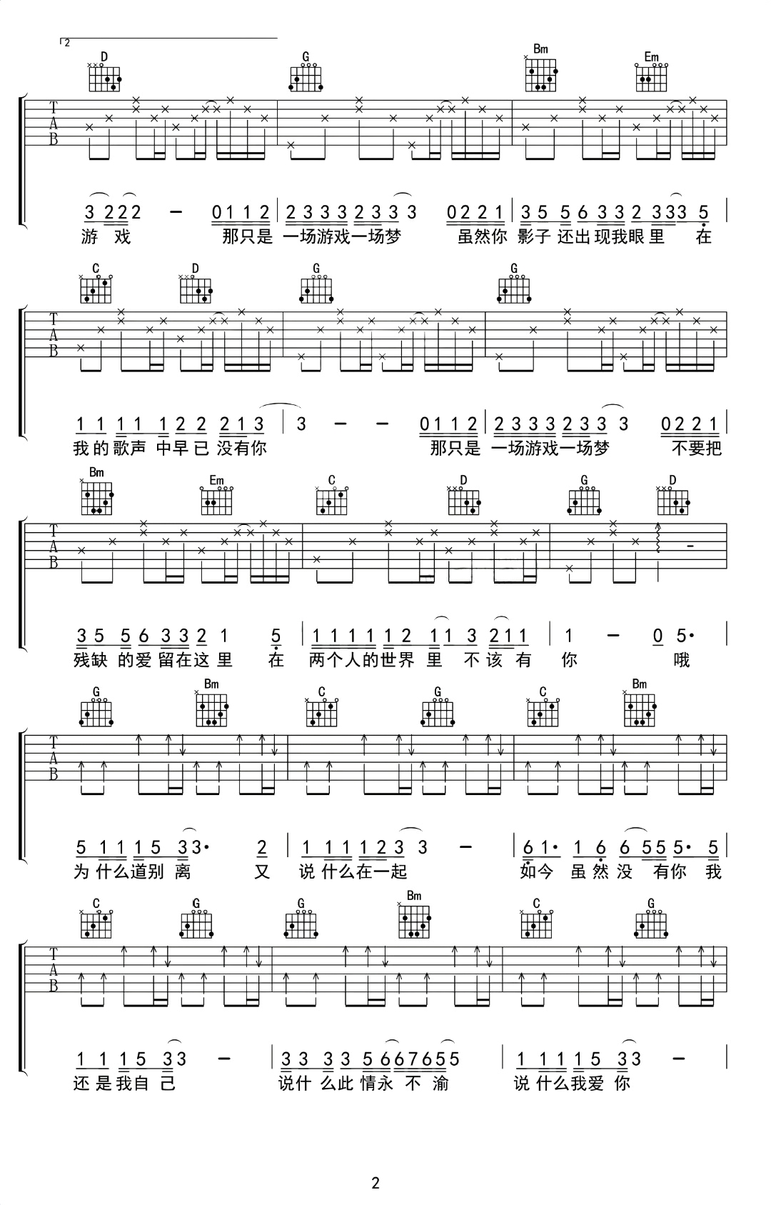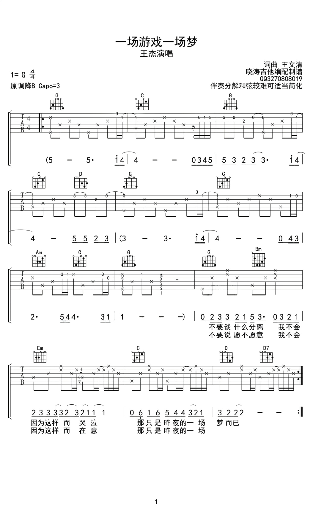 王杰《一场游戏一场梦》G调 吉他弹唱谱