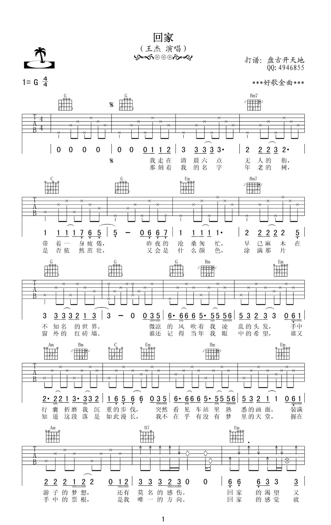 王杰《回家》G调 吉他弹唱谱