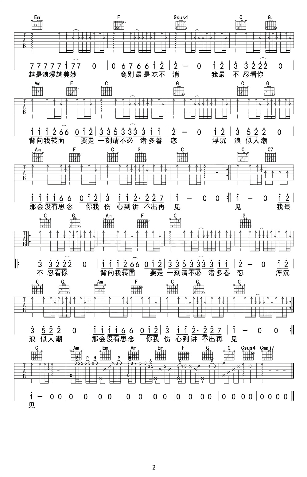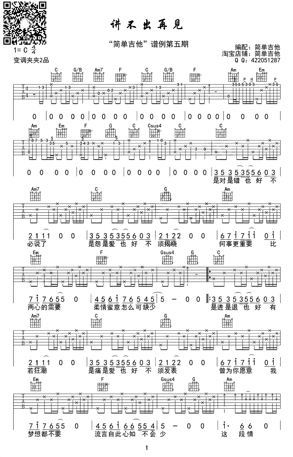 谭咏麟《讲不出再见》C 调弹唱吉他谱,以 C、Am、F、G 等和弦编织离别怅惘。前奏分解和弦轻柔铺陈,主歌扫弦节奏沉稳,副歌和弦转换利落,适配男声中音域。指尖起落间,那份欲言又止的不舍,随旋律缓缓漫开,满是经典老歌的醇厚韵味。