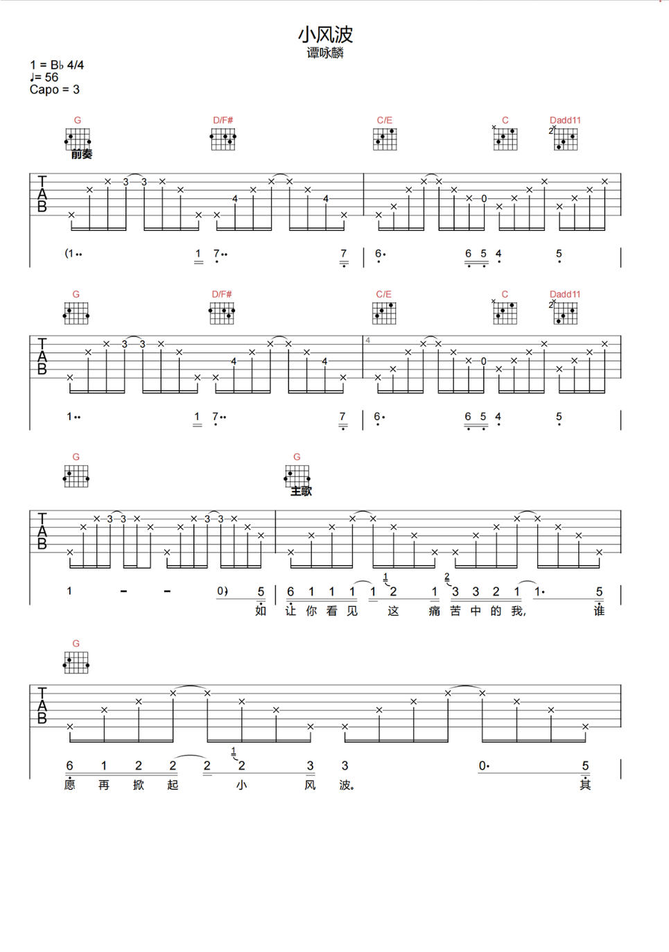 谭咏麟《小风波》降b调 弹唱吉他谱