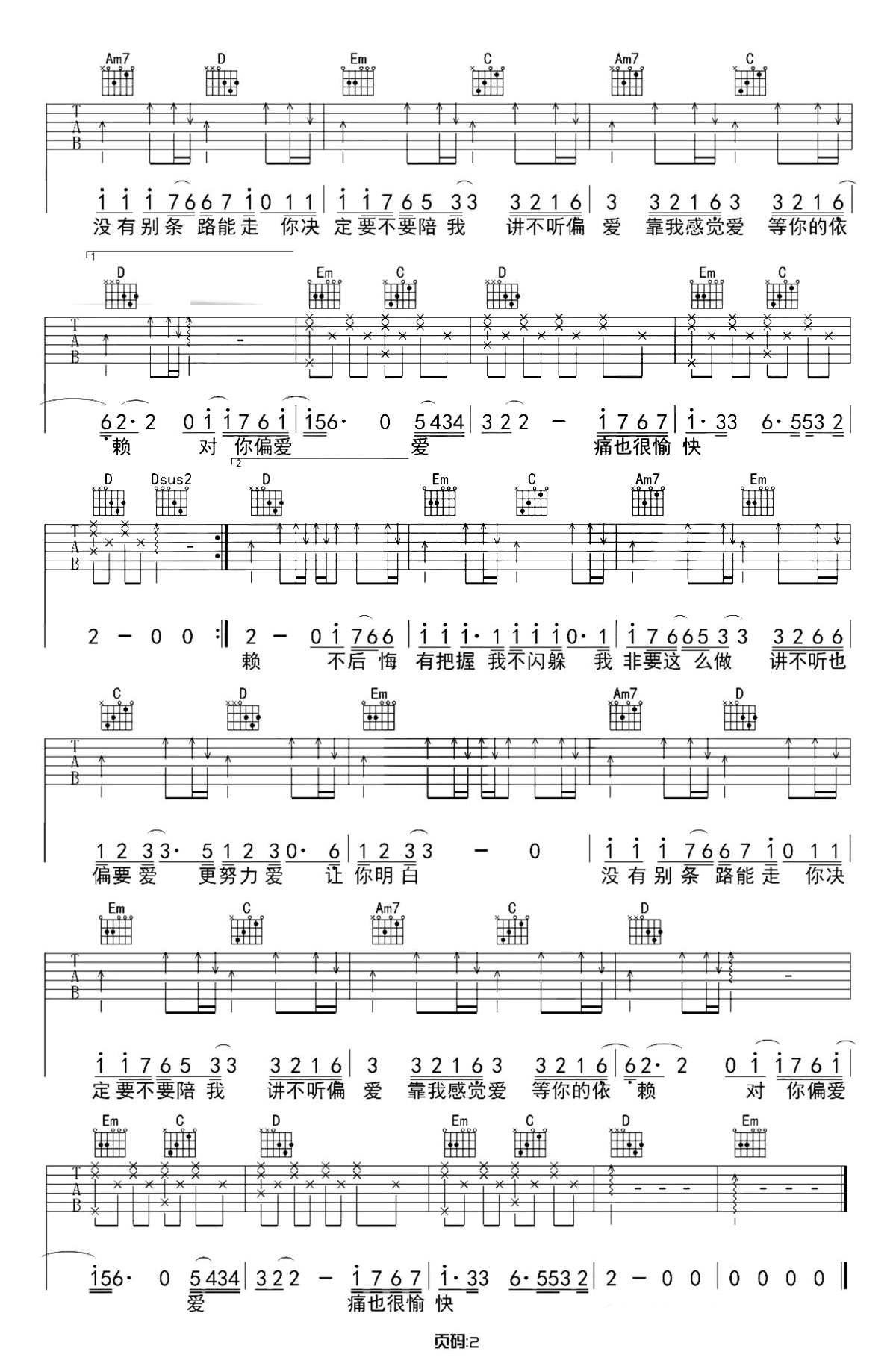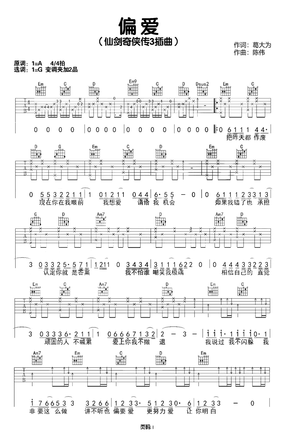 偏爱吉他图片谱,张芸京演唱的一首经典老歌,《仙剑奇侠传3》主题曲,《偏爱》吉他独奏谱,选用G调和弦指法编配,原调A,CAPO夹二品。一共两张图片吉他图片谱。