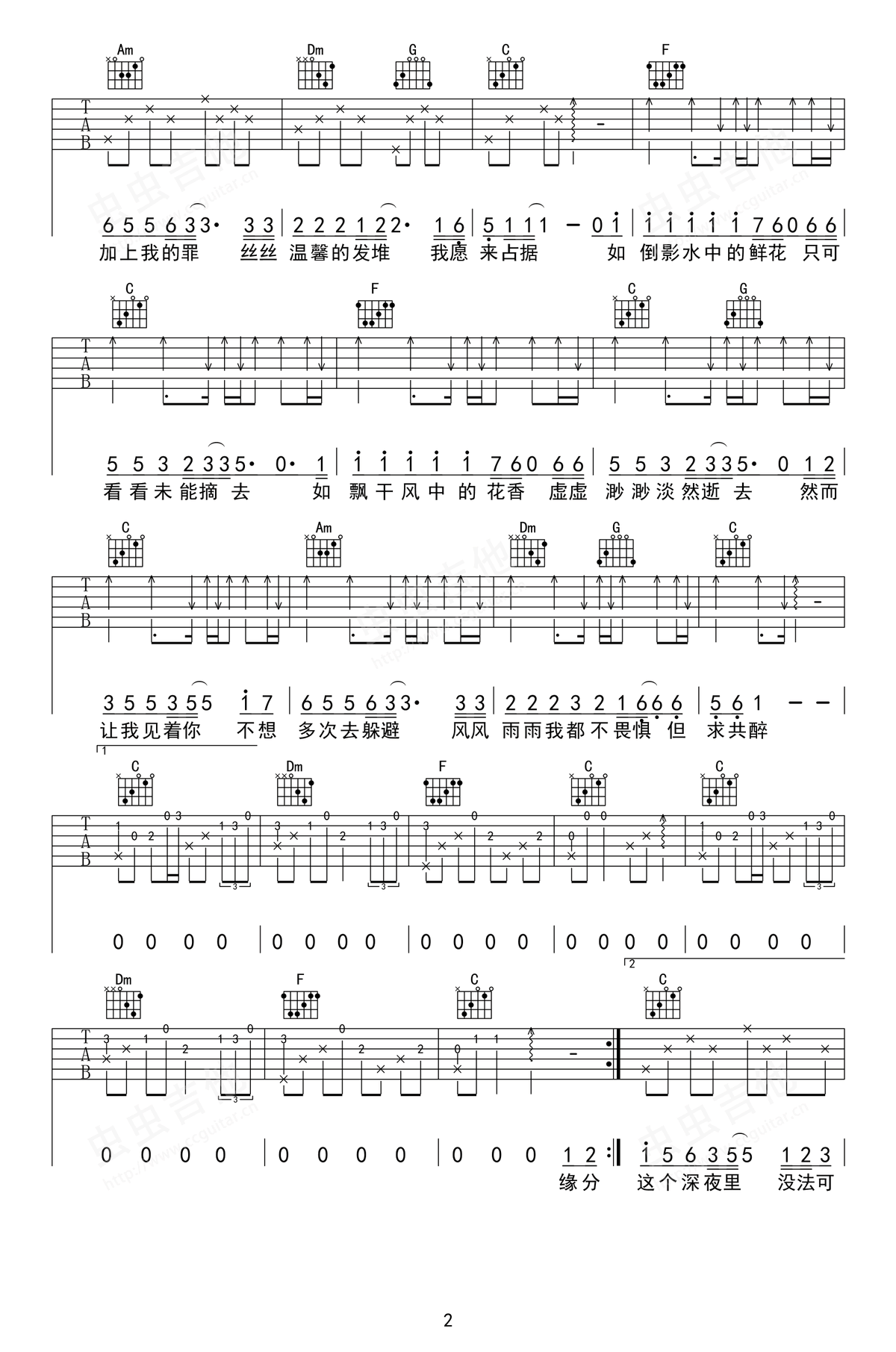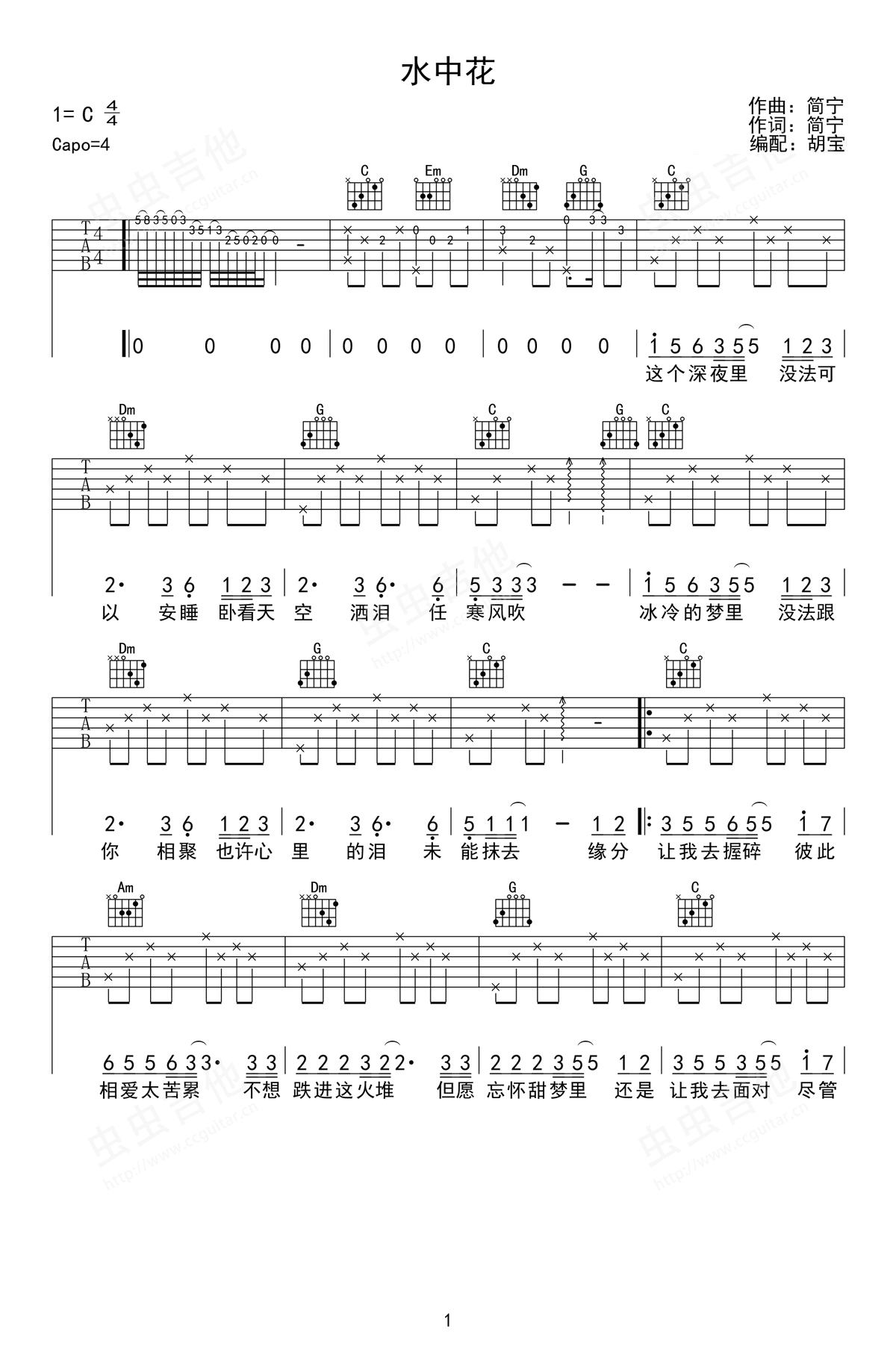 水中花吉他图片谱,谭咏麟的经典粤语歌曲,《水中花》吉他弹唱谱,选用C调指法,CAPO夹第四品品,吉他图片谱一共两张高清图片。