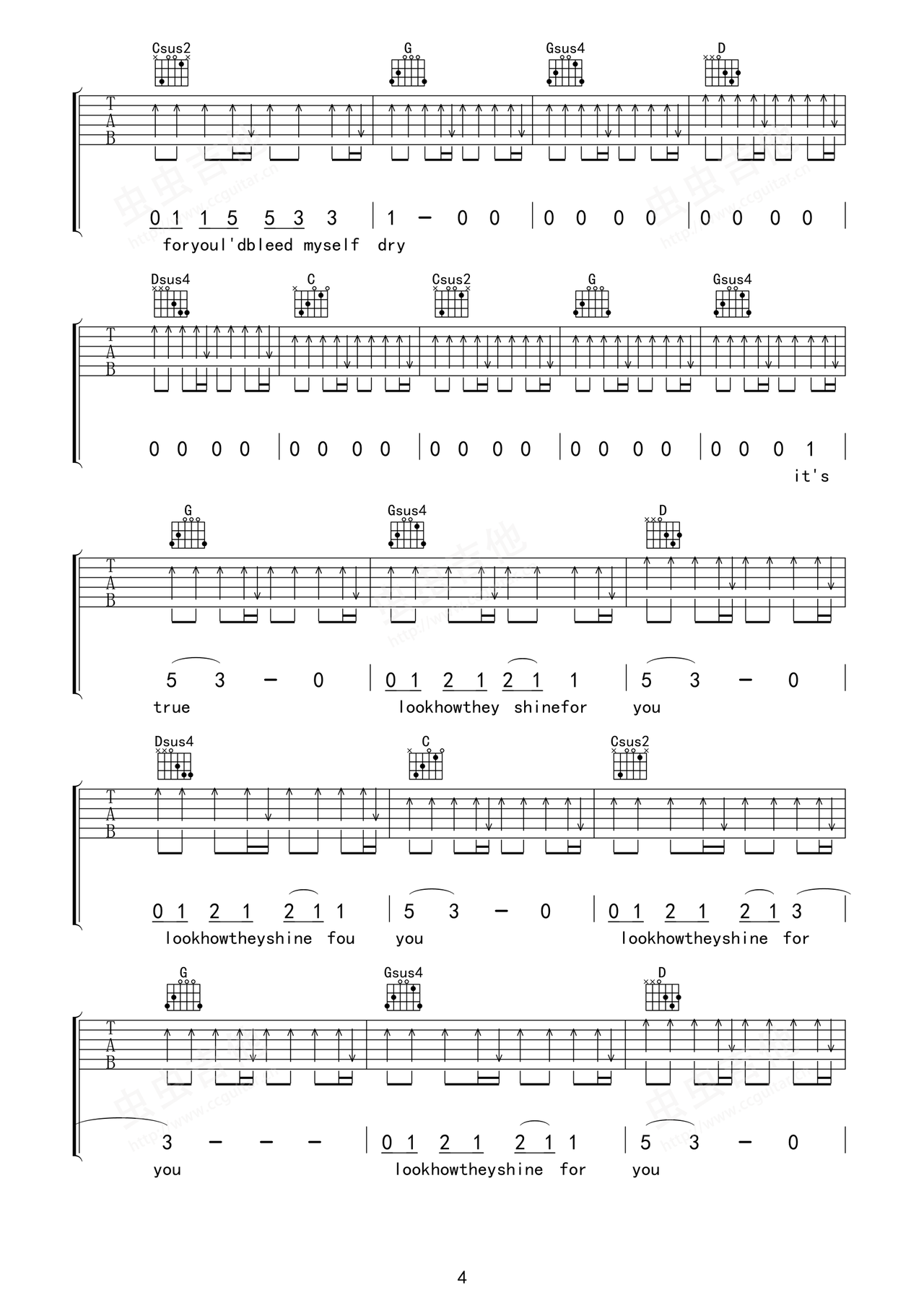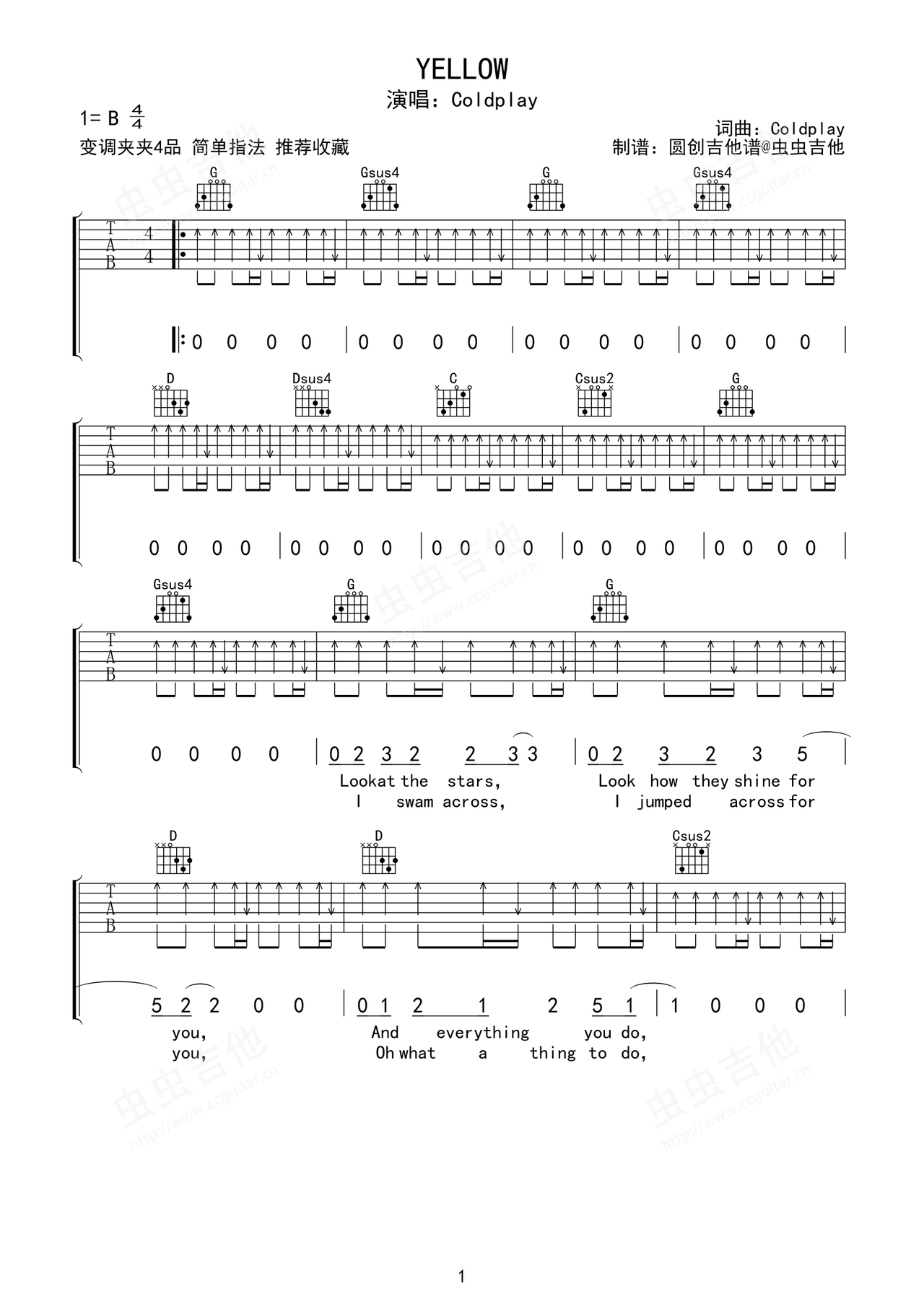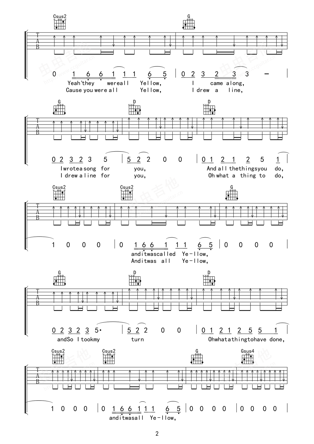 Coldplay《Yellow》吉他谱_G调_吉他图片谱,弹唱谱_完整吉他谱