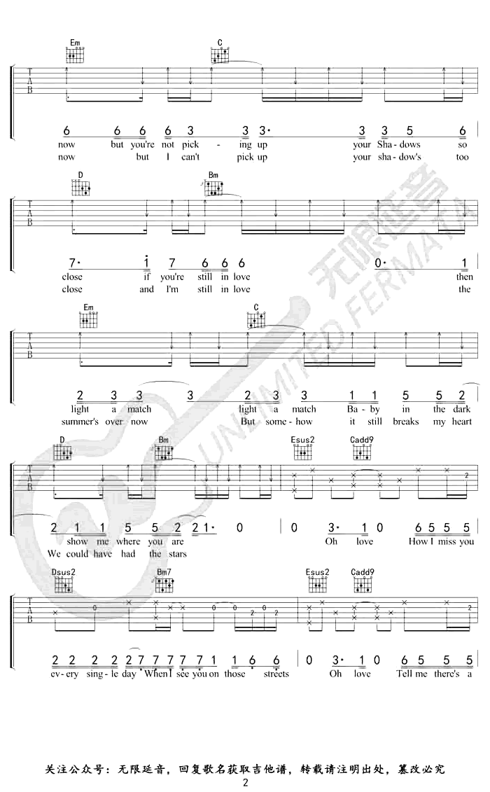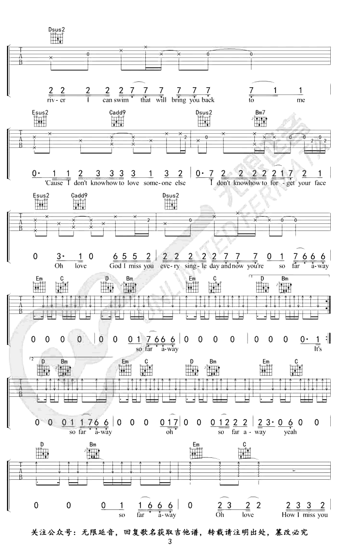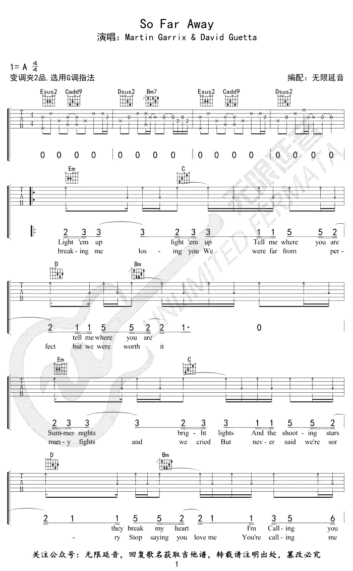 So Far Away 吉他图片谱,Martin Garrix & David Guetta的一首好听的英文歌曲歌曲,《So Far Away》吉他弹唱谱,原调A,选用G调指法编配,变调夹夹二品,完整版一共四张高清图片谱例。