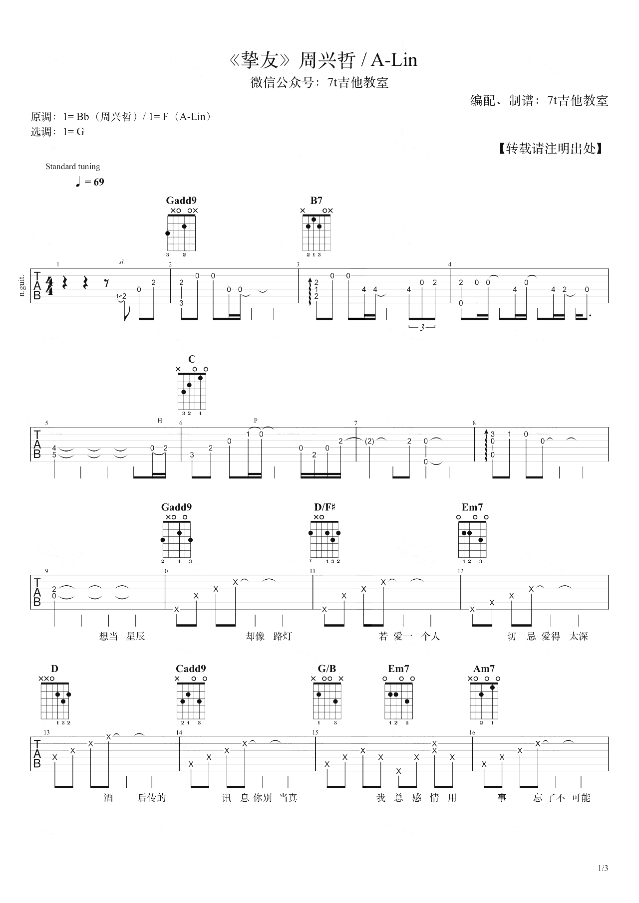 挚友吉他图片谱,周兴哲创作演唱的一首好听的情歌,《挚友》吉他弹唱谱,这首歌的原调是Bb大调,吉他图片谱用的是G大调的指法来编配,《挚友》吉他演示视频里是标准音调弦,变调夹夹在第1品。想弹周兴哲原调需夹第3品哦!如果想弹A-Lin原调需降全音调弦,不用夹变调夹~