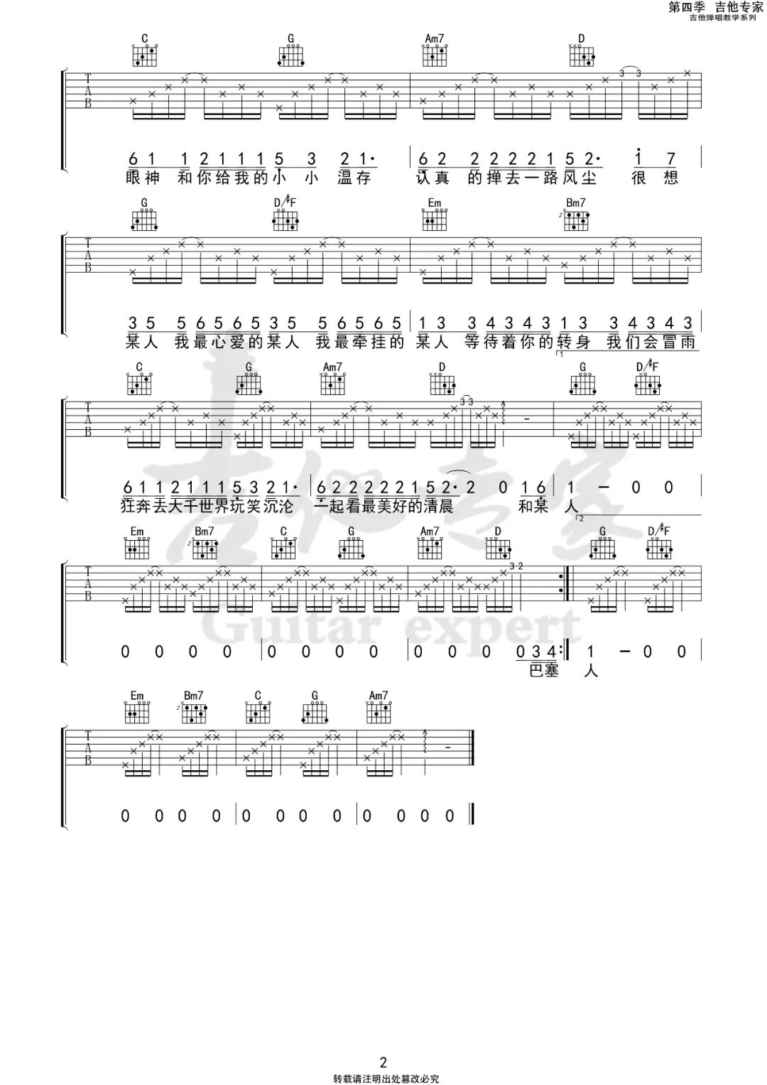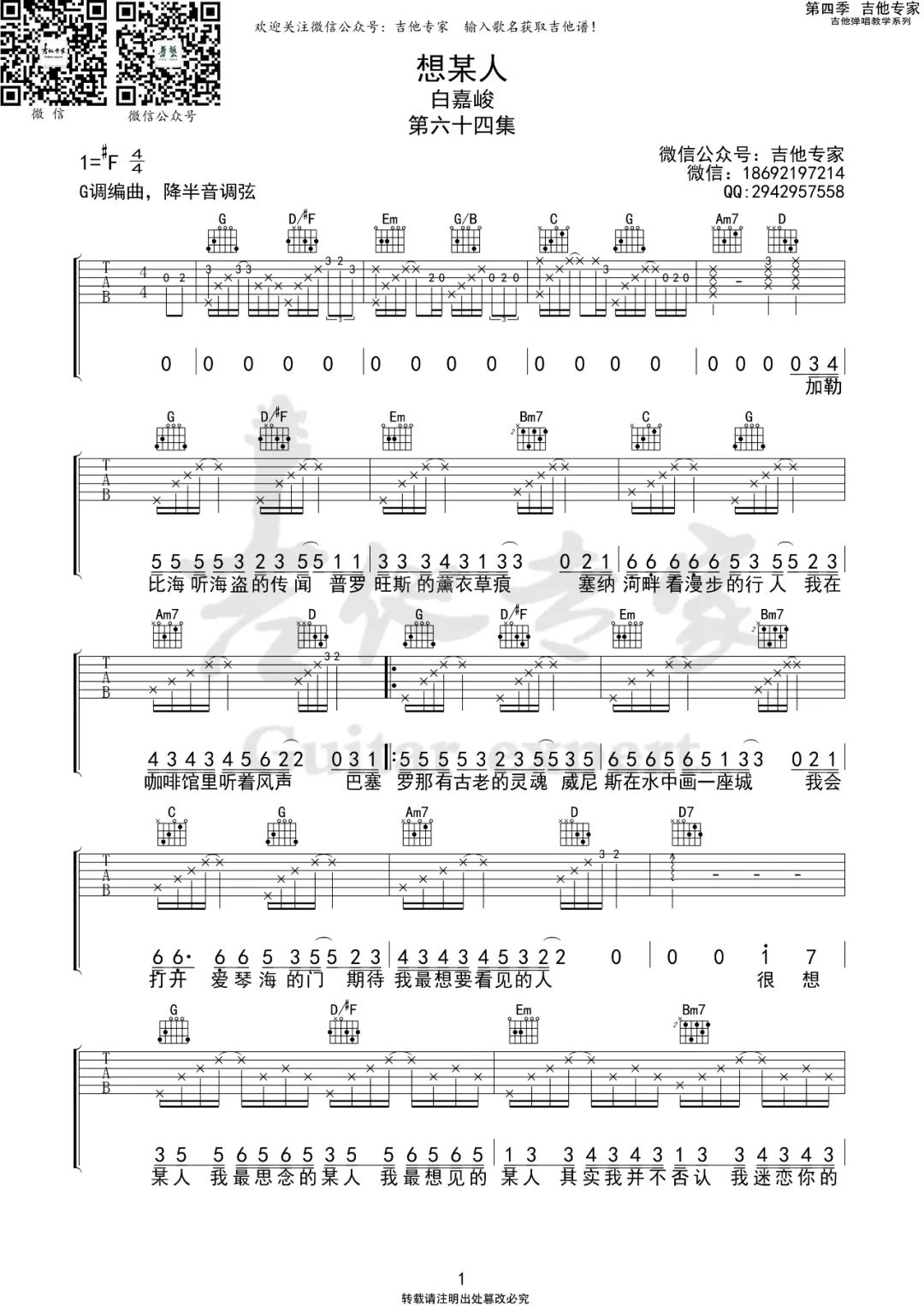 白嘉峻《想某人》G调 吉他谱
