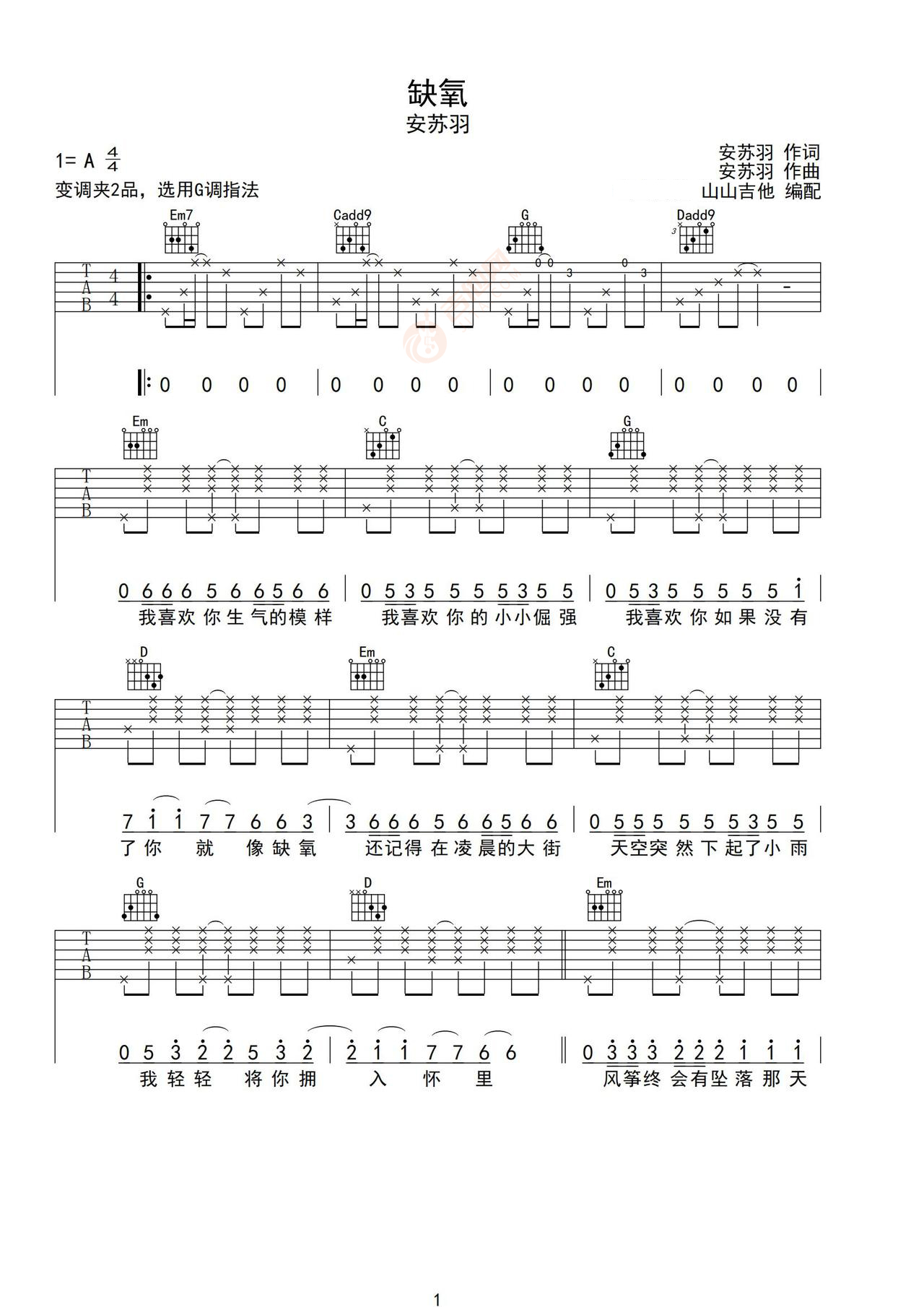 《缺氧》安苏羽 C调原版 吉他弹唱谱