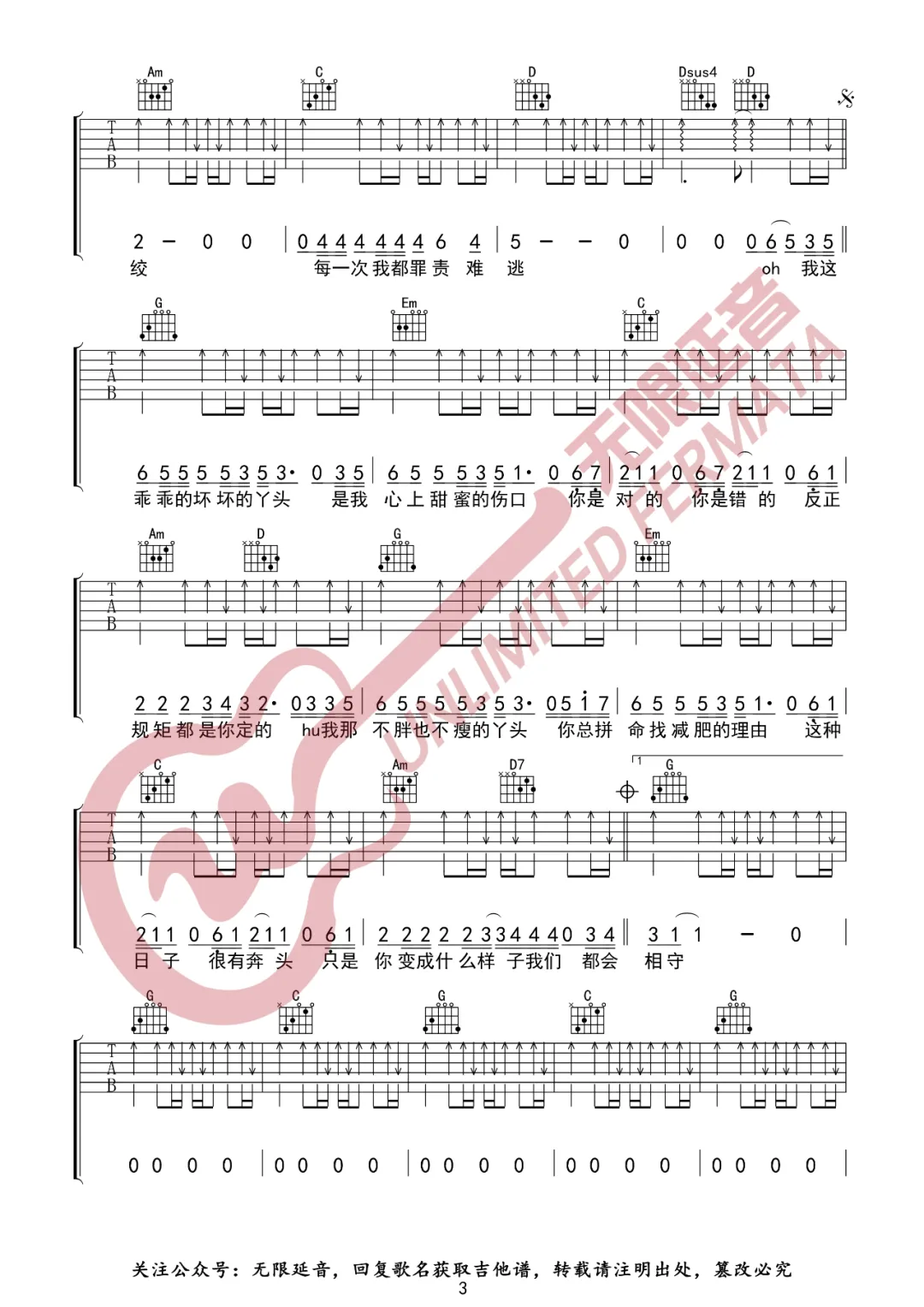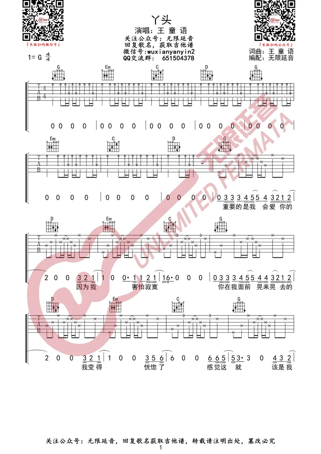 《丫头》是王童语演唱的一首歌曲,4/4拍的节奏,这首歌曲的原调为G调,这里曲谱采用了G调指法进行编配,演唱时可不夹变调夹,来源于@无限延音编配出品。