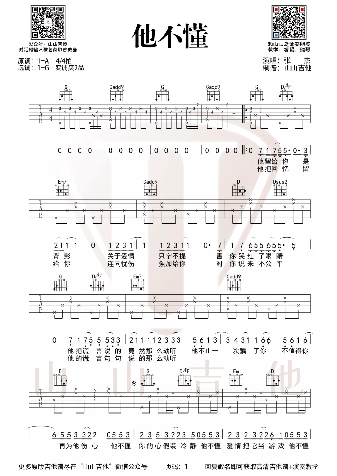 《他不懂》张杰 G调原版 吉他弹唱谱