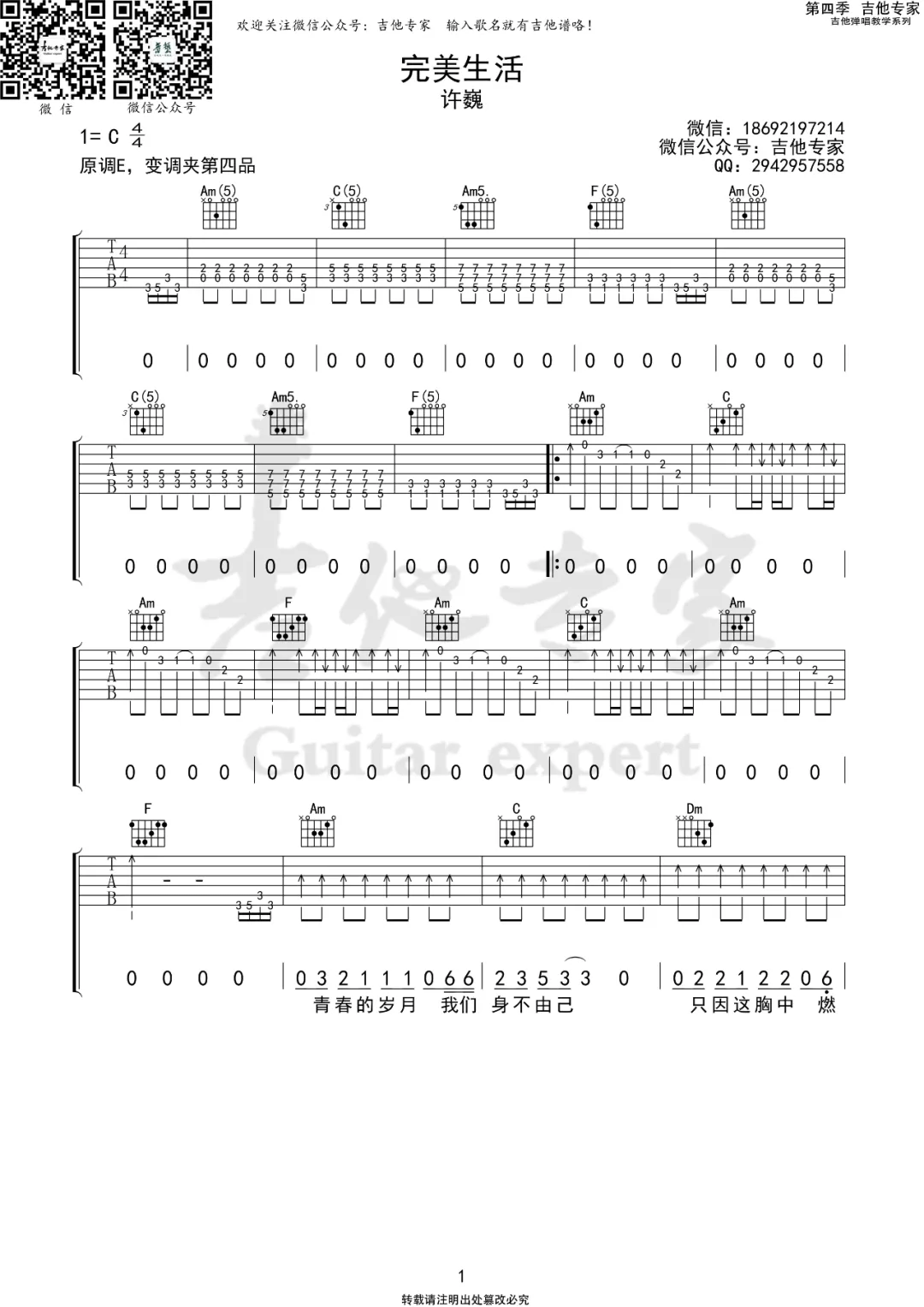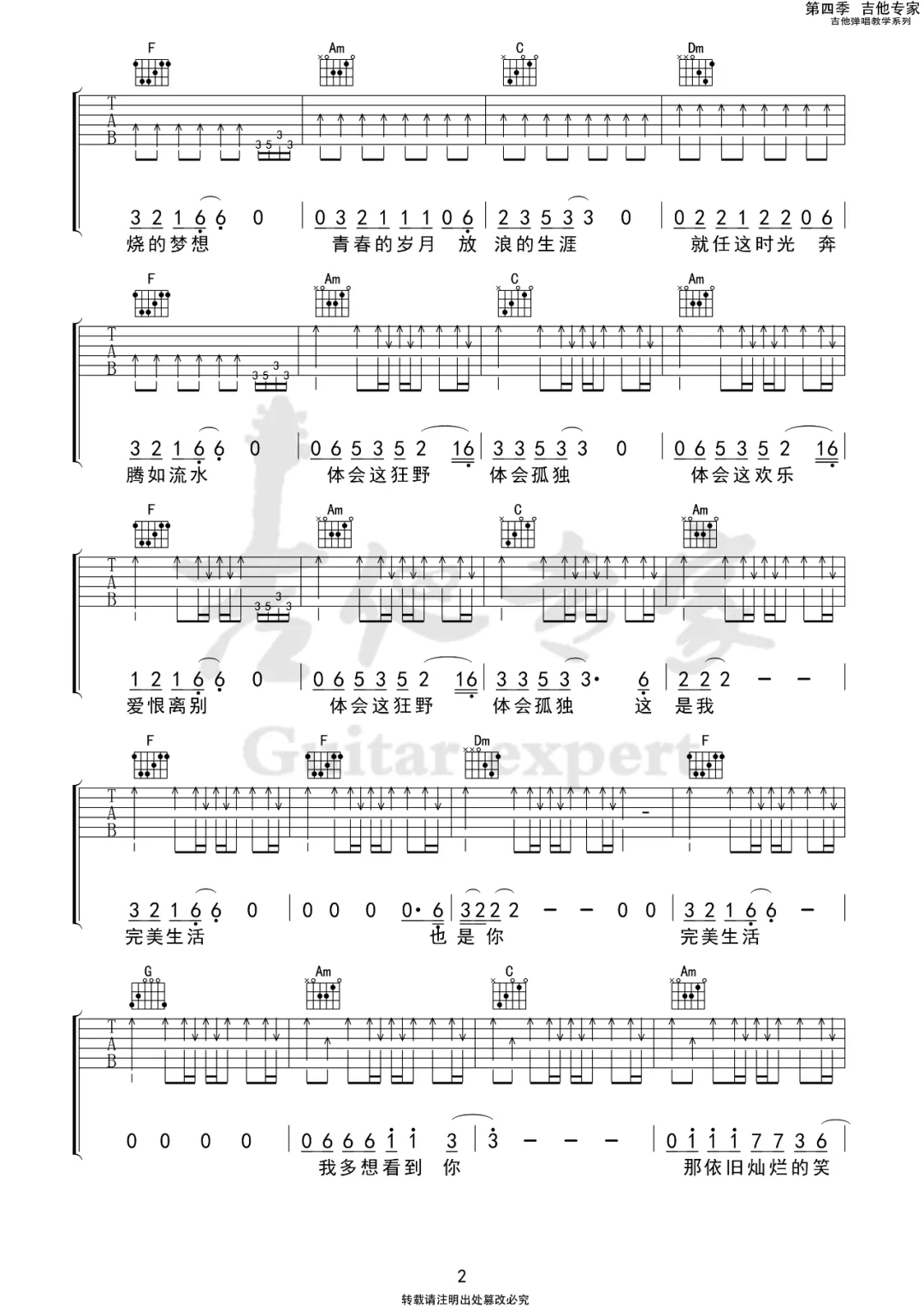一首非常经典的歌曲,几乎所有80后都熟悉这首歌,《完美生活》这首歌是4/4拍的节奏,这首歌曲的原调为E调,这里曲谱采用了C调指法进行编配,演唱时夹变调夹4品可回到原调,这首歌前奏更是很多抖音博主特别喜欢。来源于@吉他专家编配出品。