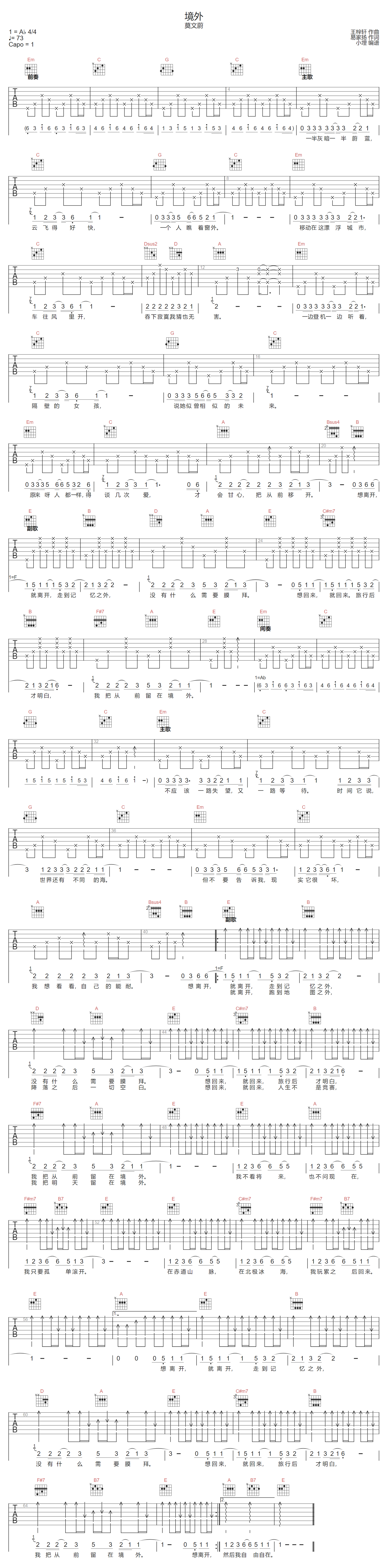 莫文蔚《境外》G 调原版弹唱谱,4/4 拍,速度 76BPM,无需变调夹即可还原歌曲空灵质感。核心和弦走向 G-Em-C-D,编配简约却精准勾勒出旅途里的孤寂与自由。