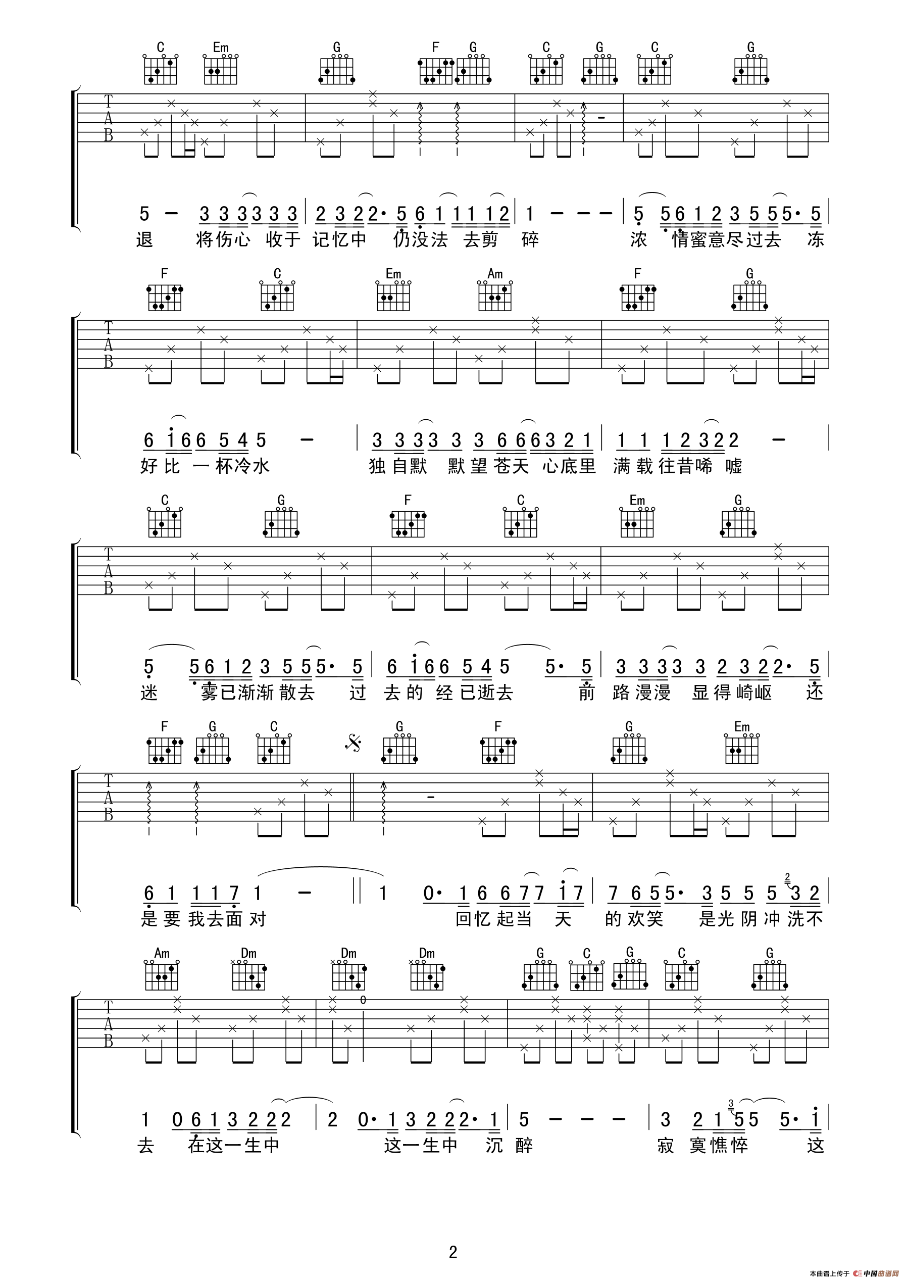 原调 F,选调 C,变调夹夹 5 品还原原版深情沧桑感,4/4 拍约 65BPM 适配歌曲舒缓叙事氛围。主歌用 T3231323 分解和弦铺垫情绪,副歌切换 **↓↓↑ ↑↓↑** 扫弦释放深情张力。和弦核心走向 C - Am - F - G,桥段加入 Em 过渡增强层次感,间奏可简化为单音旋律呼应原曲小提琴线条。弹唱时把控气息与强弱,突出歌词里爱恨纠葛的无奈,新手多加练习即可驾驭这首经典粤语情歌。