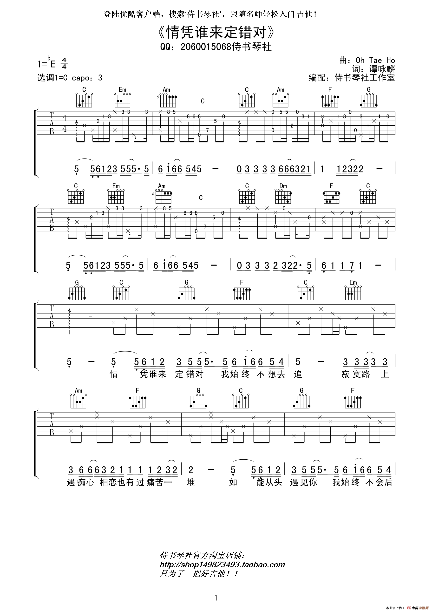 谭咏麟《情凭谁来定错》C调 弹唱吉他谱