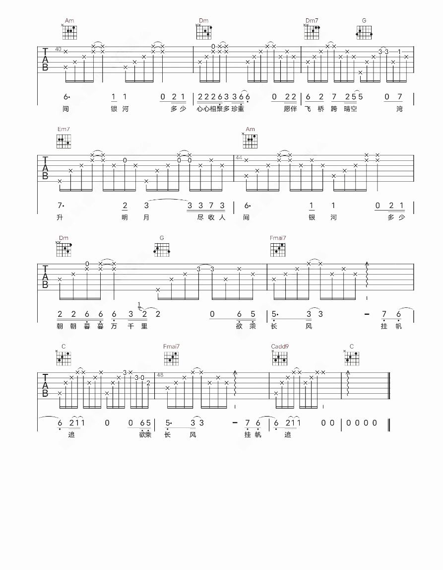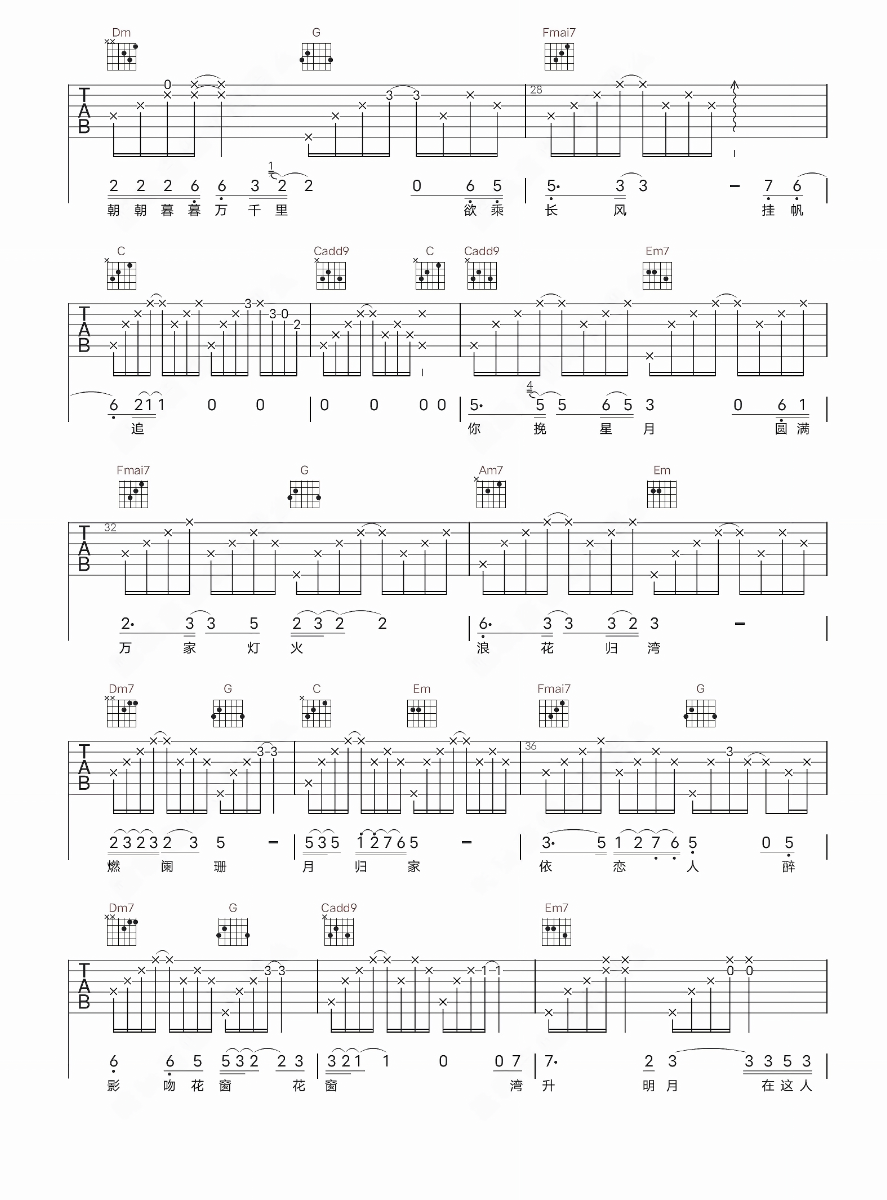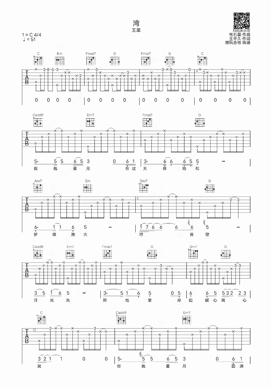 《湾》C 调编配贴合原调,无需变调夹,4/4 拍约 75 拍速,新手友好。核心和弦 C、G、Am、F、Em,无复杂指法。主歌用 53231323 分解和弦铺陈温情,副歌轻扫弦推情绪,前奏间奏重复核心和弦强化意境。弹唱时气息轻柔,让吉他与歌声交织,诠释湾区团圆与守望的深情,慢练即可驾驭这首晚会金曲。