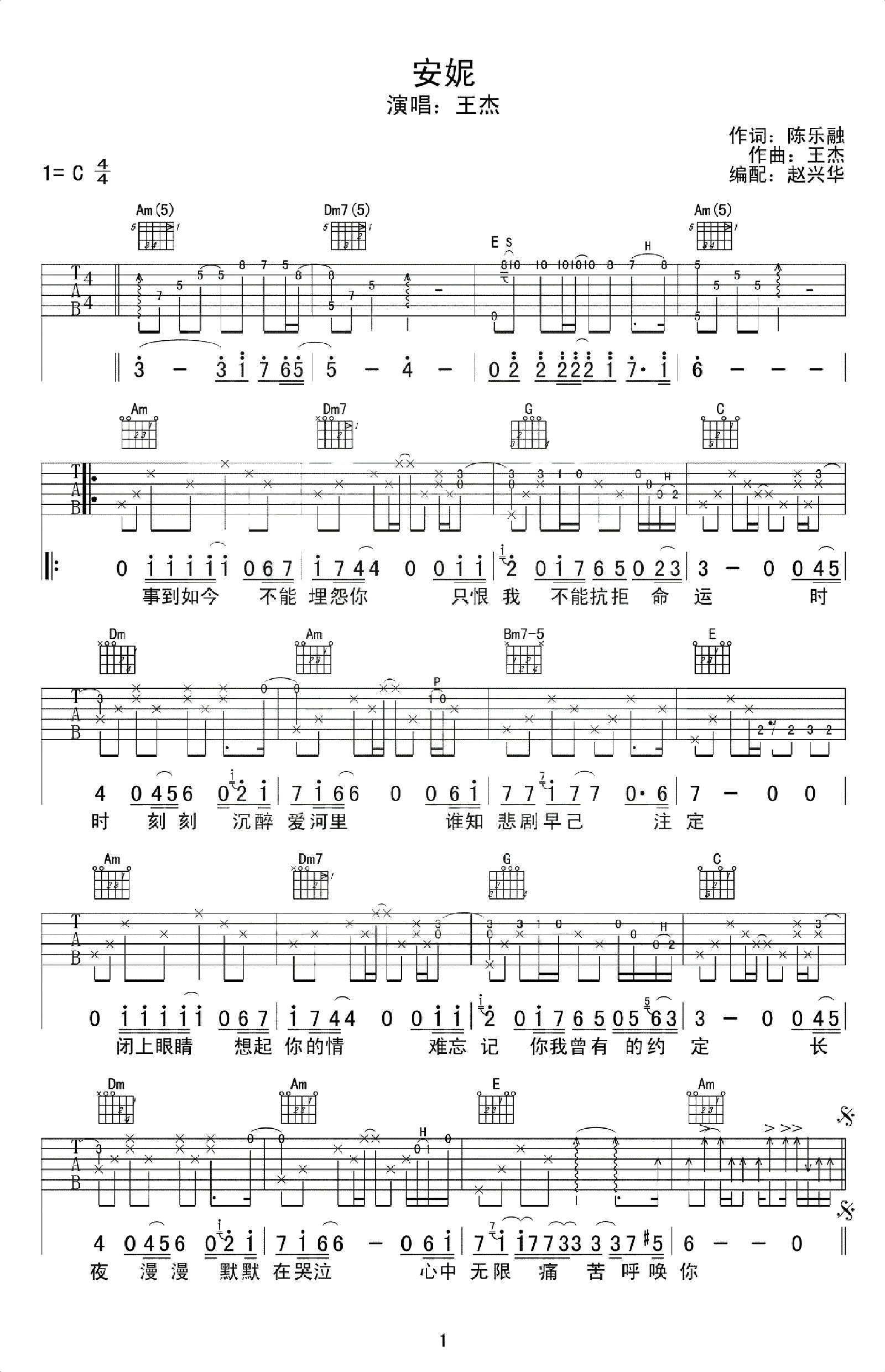 王杰《安妮》C调 吉他弹唱谱