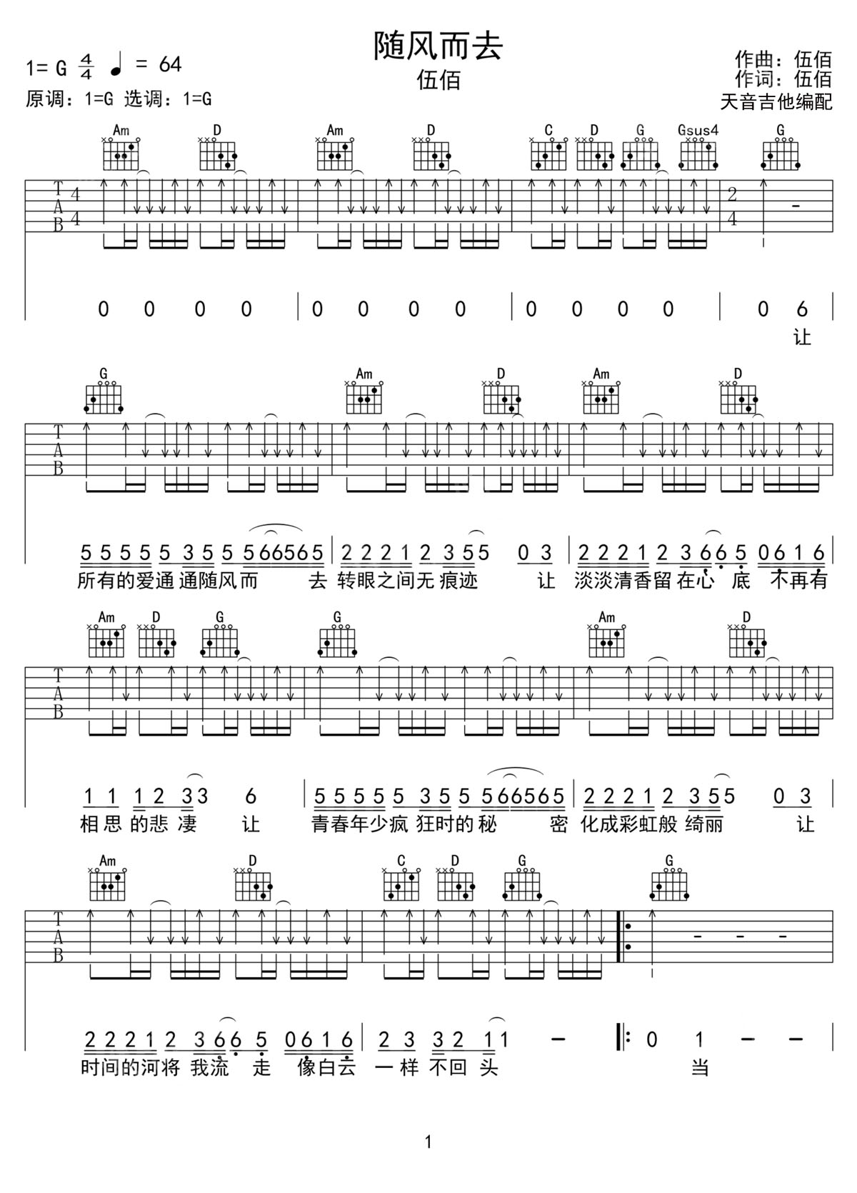 伍佰《随风而去》吉他谱_G调扫弦版弹唱谱-图1