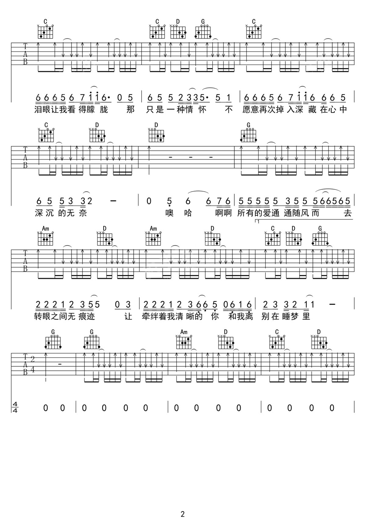 伍佰《随风而去》吉他谱_G调扫弦版弹唱谱-图2