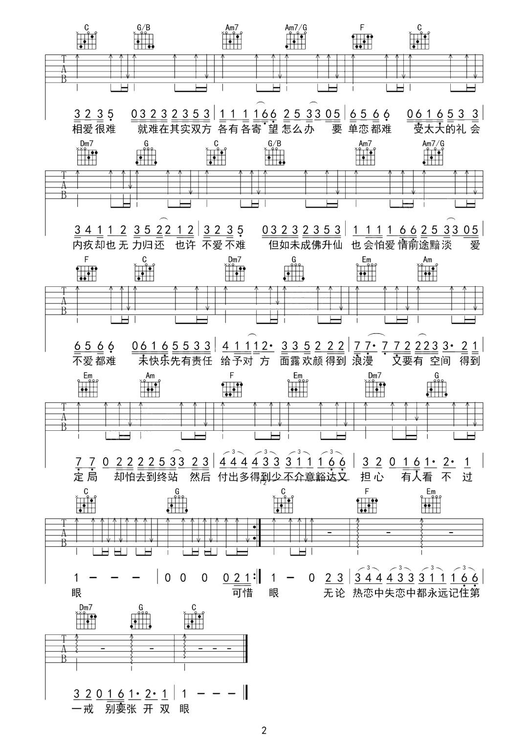 相爱很难吉他谱,歌曲原调为C调,此版本的曲谱来源于@网络转载,为4/4拍的节奏,按C调指法编配,共2张高清吉他谱,变调夹不夹为原歌曲的调式,演唱时可按个人音域选择合适的变调夹位置。