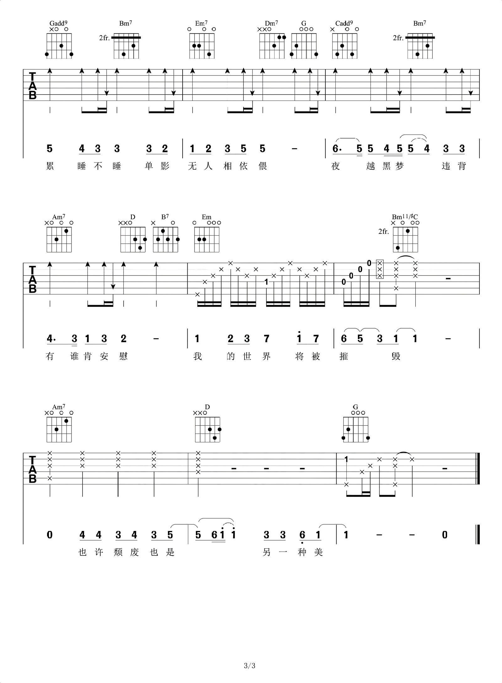 周杰伦《世界末日》G 调弹唱吉他谱,以简单和弦编织满溢的 emo 情绪。G、Em、C、D 基础和弦走向适配新手,扫弦节奏舒缓低沉,契合原曲的怅惘氛围。男声选调友好易唱,和弦转换间,失意心绪随琴弦震颤漫开,复刻那份藏在旋律里的遗憾。