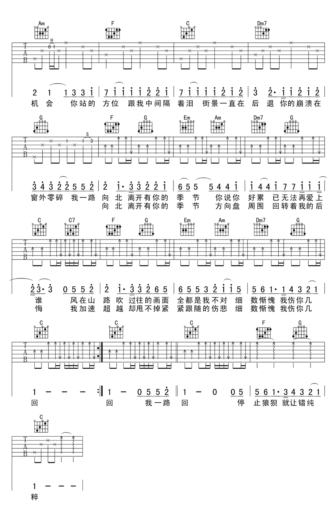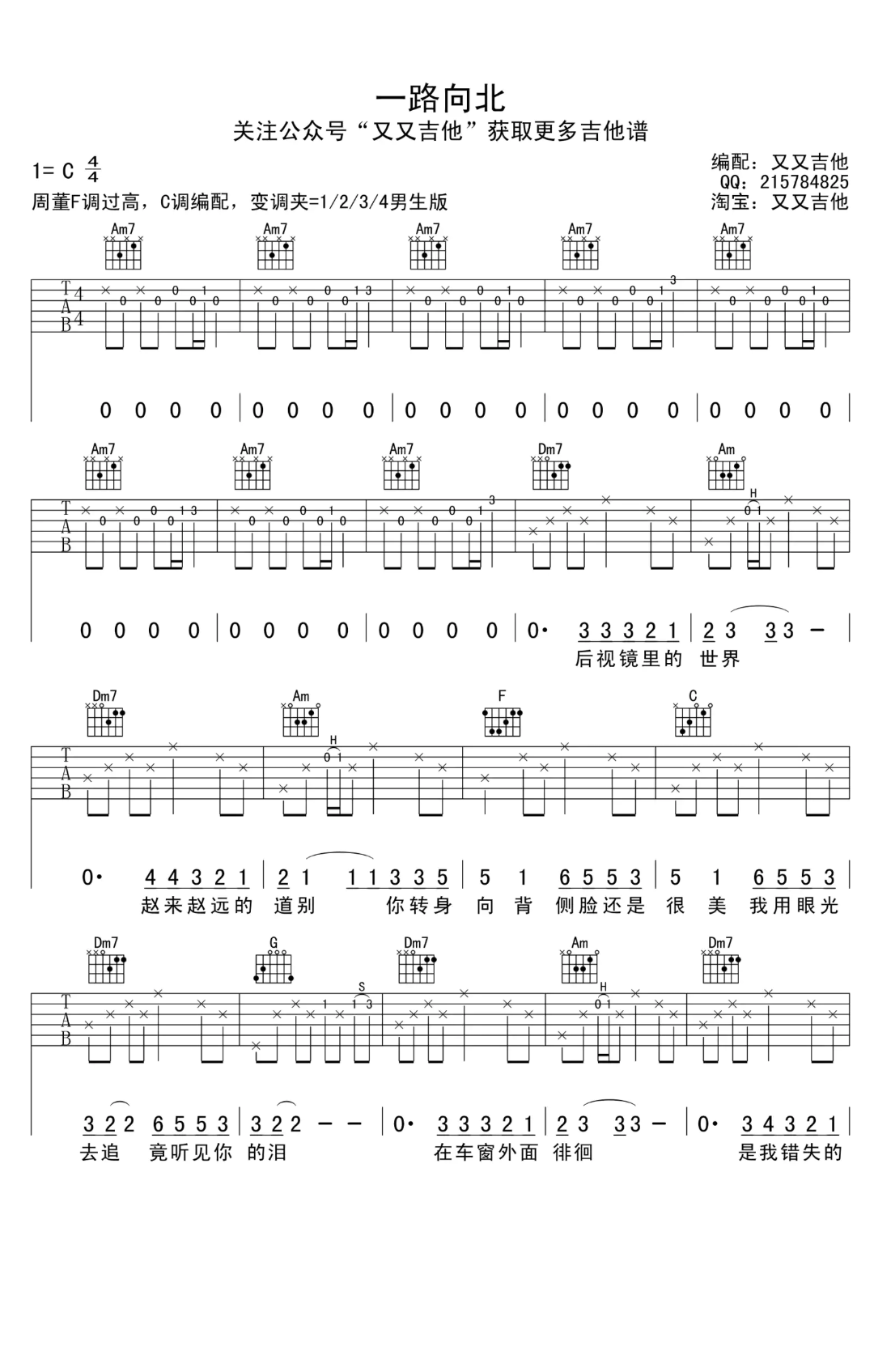 周杰伦《一路向北》C调 弹唱吉他谱